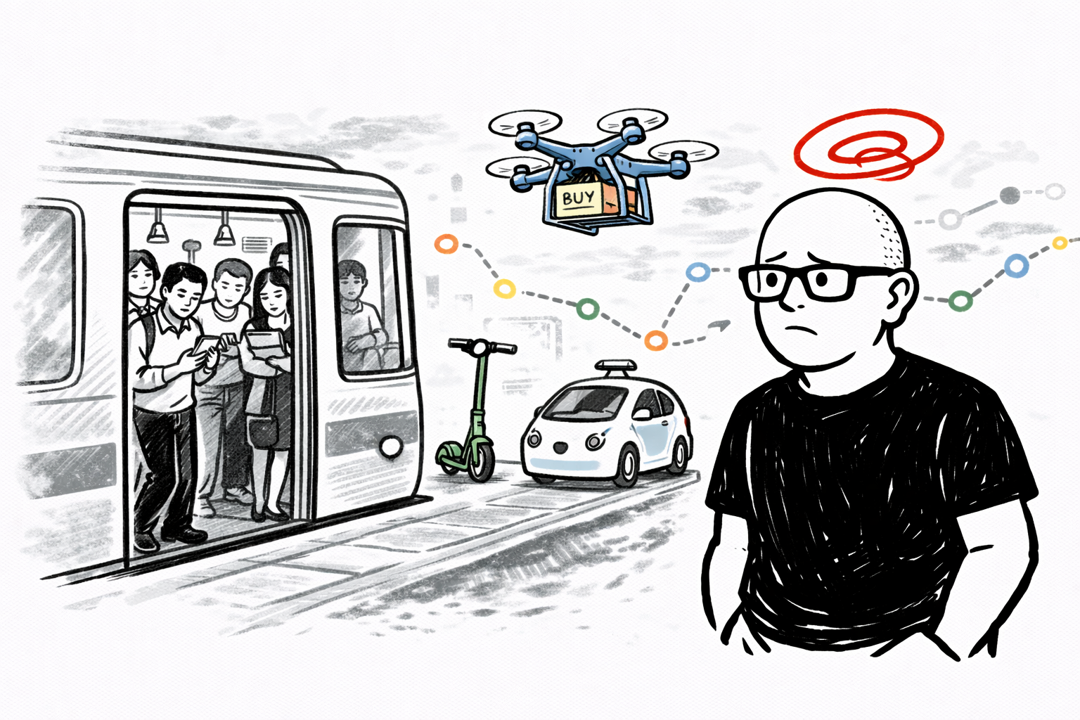 A few years ago, I would never have imagined becoming an ethnographer of the train. But geopolitics has a way of rearranging the mundane. As fuel prices surge, a consequence of unnecessary war in the Middle East and trade wars, all decided in distant corridors of power. The ripple effect has forced me to switch from my car to public transport. From driving the lines, tracing my own routes through the road network insulated in steel and glass, I was thrown in with everyone else. What I found has become curious. A train line is not simply a route through space. It is a line, physical and imagined, entangled with a multitude of lives, intentions, and temporalities. Knotting together and unravelling at each station along the journey. A student boards at one stop, a shift worker departs at the next, and a consultant opens a laptop three stations later. The line gathers and disperses, gathers and disperses. Each node of the collection station, platform, and carriage doors rounds up and orders human packages. People gather, but they do not meet. They are collected. Sorted. Loaded. Pack away. Arriving at the station or stop, bodies pour out in a slow, uniform current, phones in hand, heads bowed. I couldn’t shake the image of workers leaving the machine in Fritz Lang’s Metropolis . The same shuffling gait. The same downcast eyes. But these aren’t labourers broken by industrial discipline. These are knowledge workers, voluntarily tethered. I began to think of the smartphones as umbilical cords. Unnecessary ones at that. These digital entanglements connect each person to hegemonic entities they can barely name or conceive. Big tech, algorithmic processes, AI, data architectures, concepts that don’t enter the mind of the commuter. So who is nourishing whom in this arrangement? The user feels connected, sustained. The platform extracts attention, data, and behavioural surplus. Both parties believe the other is the dependent. And then there were the laptops. People are already working buried in emails, spreadsheets, Slack messages — before they’d arrived at the office. Whatever happened to the Australian ethos of working to live rather than living to work? That sensibility assumed a clean boundary between labour and leisure, between the office and the beach. The smartphone has erased or weakened that line. Work, rest, and distraction occupy the same device, posture, and glazed expressions. You cannot tell from looking whether someone is answering their manager or scrolling memes. The activity is identical. I noticed all of this because I was reading Tim Ingold’s Life of Lines , a physical book, held in two hands, which, of course, is its own technology of insulation. Ingold distinguishes between the wayfarer, who moves attentively through the world, and the transported person, who is essentially a parcel moved from one destination to another. My fellow commuters had gone further. They were being transported through physical space while simultaneously being transported through digital space. Present in neither. Autonomous in neither. The train line, this thing that entangles us all at different points of time and space, had become merely a conduit, its knots of human meeting pulled tight and never opened. The car windscreen has been replaced by the phone screen. The private cabin has been replaced by the digital bubble. The insulation persists. It just changed the substrate. I looked up from my book and saw lines everywhere. The fixed line of the rail corridor. The invisible lines of the wireless signal. The lines of text on every screen. The lines of force run from Washington to fuel pumps to household budgets to train tickets. And the line I was travelling, entangled with a multitude at different points of time and space, knotting and unknotting at every station. We were all following lines. None of us chose quite where they led. Perhaps the most honest thing I can say is this: I am one of the drones, too. I was reading a book about lines while being carried along one, performing a more prestigious version of exactly what everyone else was doing, absent from the shared space, following a thread of my own. The only difference was the moment I looked up. Maybe that’s enough. The ethnographic instinct isn’t immune to the pattern. It’s the willingness to notice you’re in it.